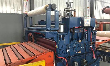 設備在工作時開卷機處于送料狀態,板料進入整平機校平后,再經電眼控制活套、側向機構進入NC定尺裝置,NC定尺裝置按設定好的尺寸定尺向后工序剪床送料;當NC送料達到設定尺寸時,設備停止送料同時將信號傳給剪床,由剪床將板料切斷,切下的板料經輸送裝置送入集料架整齊堆垛,堆垛鋼板的升降臺可隨堆垛鋼板高度的增加而自動下降;當堆垛鋼板張數達觸摸屏設定值時,生產線自動停機,此時人工控制降下升降臺,將出料臺車開出,同時開進另一臺出料臺車,即進入下一工作循環。