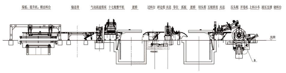 本設備的工作流程:本設備是將鋼板(各種金屬材料卷)通過整平后、定尺橫剪的方式把鋼板加工成客戶需要尺寸的專用剪切設備。該生產線的主要設備由收紙機、液壓上料小車、開卷機、接料鏟頭、整平主機、渡橋、NC定尺送料機、靜電覆紙機構、高速剪床、集料等機構構成,中間輔以運料、緩沖、引導、輸送、出料等裝置。