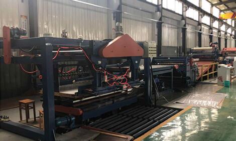 設備在工作時開卷機處于送料狀態,板料進入整平機校平后,再經電眼控制活套、側向機構進入NC定尺裝置,NC定尺裝置按設定好的尺寸定尺向后工序剪床送料;當NC送料達到設定尺寸時,設備停止送料同時將信號傳給剪床,由剪床將板料切斷,切下的板料經輸送裝置送入集料架整齊堆垛,堆垛鋼板的升降臺可隨堆垛鋼板高度的增加而自動下降;當堆垛鋼板張數達觸摸屏設定值時,生產線自動停機,此時人工控制降下升降臺,將出料臺車開出,同時開進另一臺出料臺車,即進入下一工作循環。