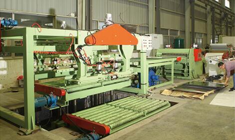 設備在工作時開卷機處于送料狀態,板料進入整平機校平后,再經電眼控制活套、側向機構進入NC定尺裝置,NC定尺裝置按設定好的尺寸定尺向后工序剪床送料;當NC送料達到設定尺寸時,設備停止送料同時將信號傳給剪床,由剪床將板料切斷,切下的板料經輸送裝置送入集料架整齊堆垛,堆垛鋼板的升降臺可隨堆垛鋼板高度的增加而自動下降;當堆垛鋼板張數達觸摸屏設定值時,生產線自動停機,此時人工控制降下升降臺,將出料臺車開出,同時開進另一臺出料臺車,即進入下一工作循環。